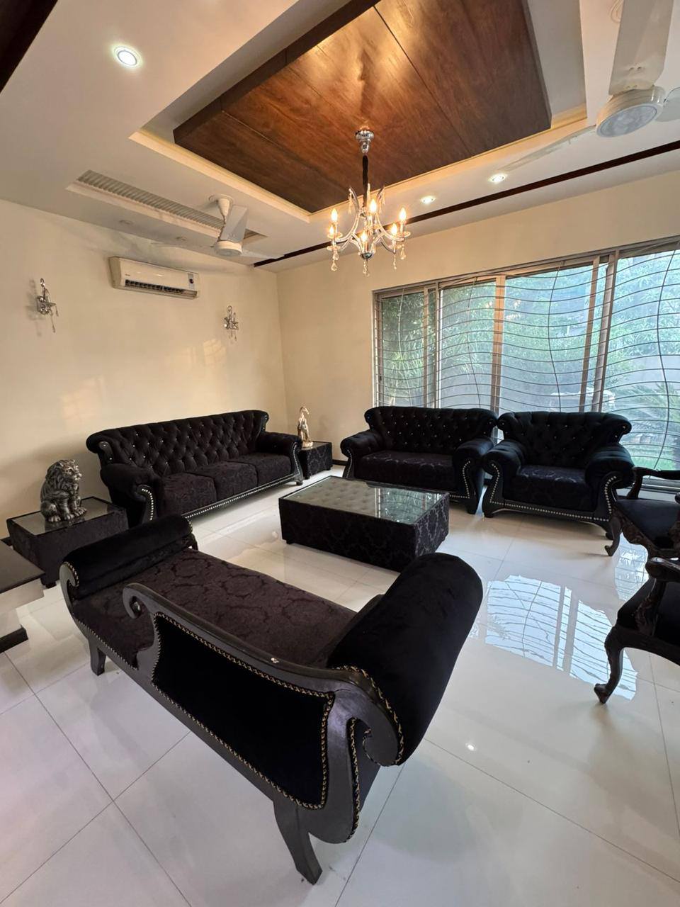 The house features 5 spacious bedrooms with built-in Interwood wardrobes, a maid room with attached bath, 2 master bedrooms with Jacuzzi tubs, 5 gas fireplaces, and 10 split ACs (including kitchen). It also includes a well-maintained garden with organic fruits and vegetables, stylish chandeliers, and tasteful décor throughout.