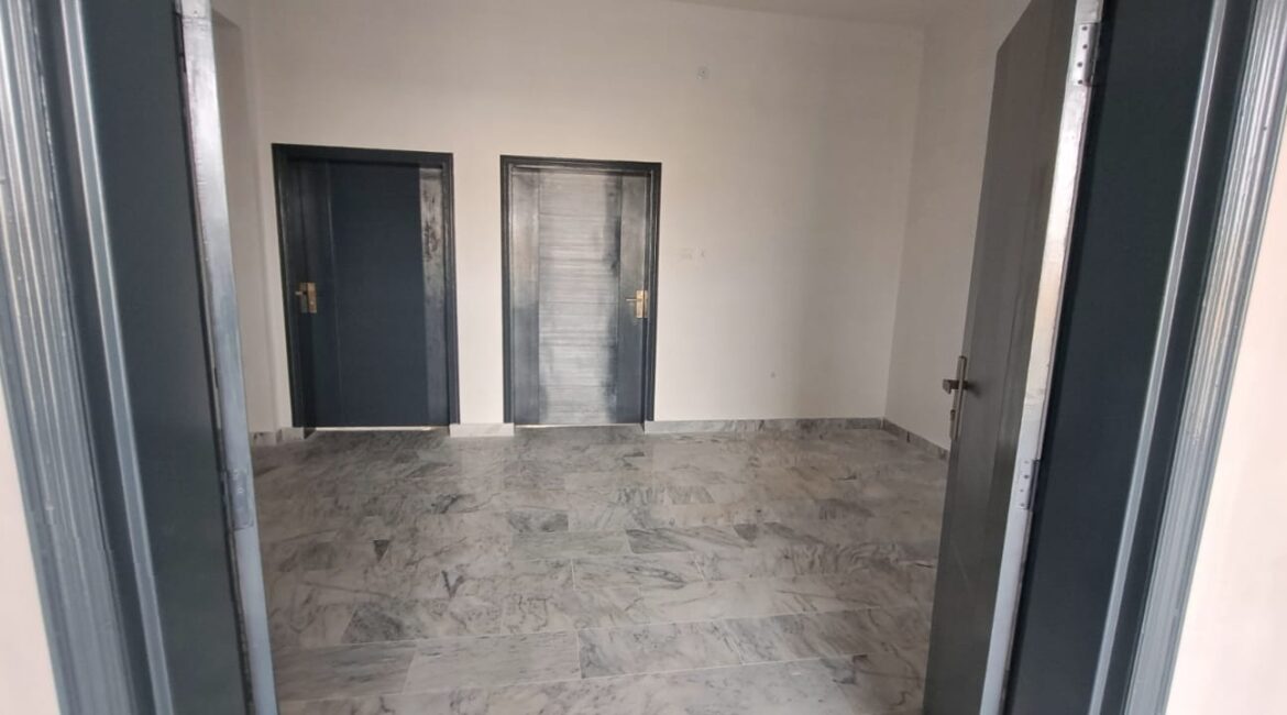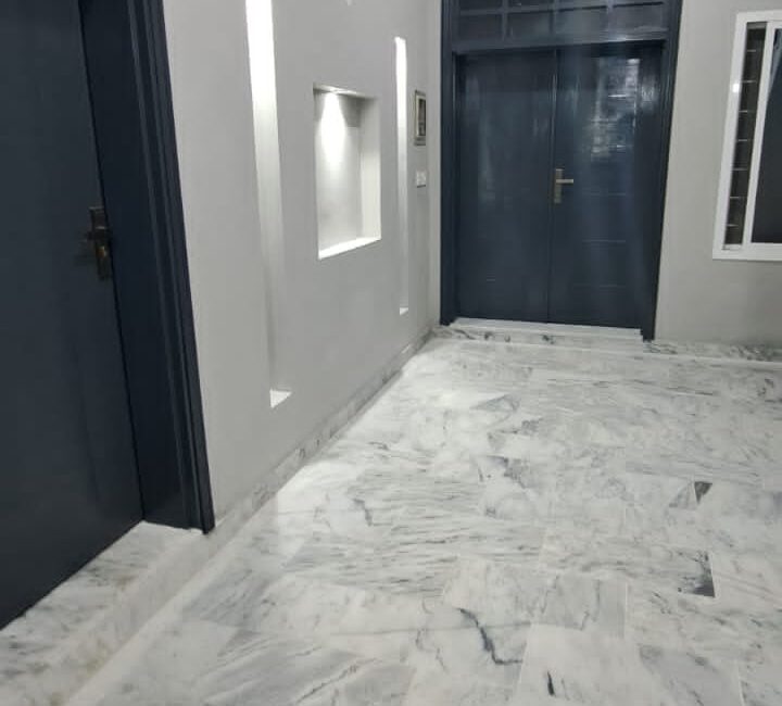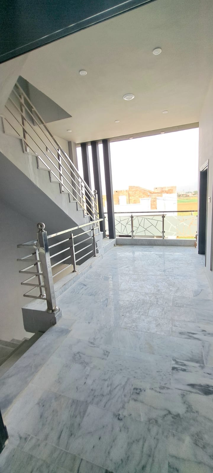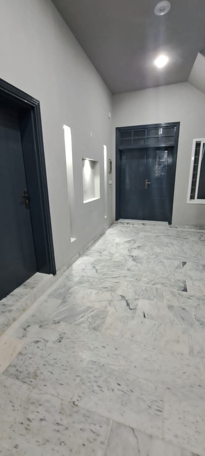 The house features 5 bedrooms, a drawing room, attached bathrooms, 2 halls, and 2 kitchens. The flooring is done with wall-to-wall marble and tiles, giving it a clean and modern look. All basic facilities including electricity, gas, and water are available.